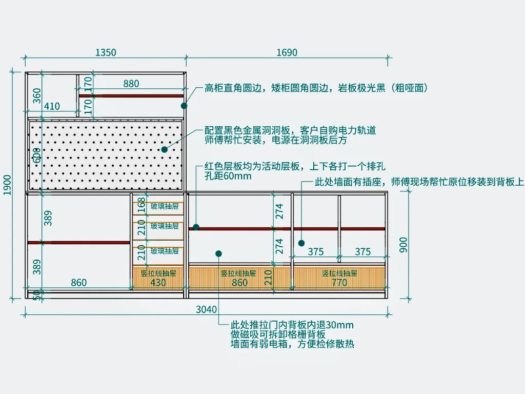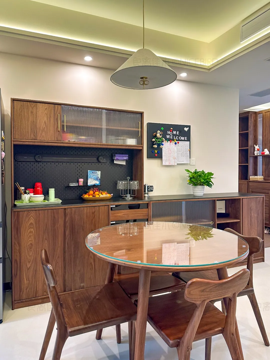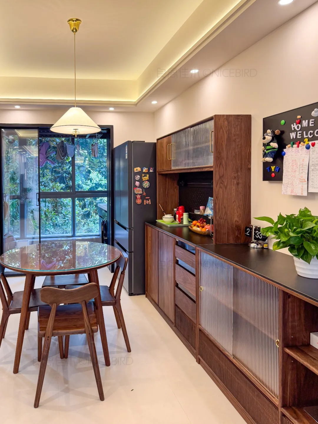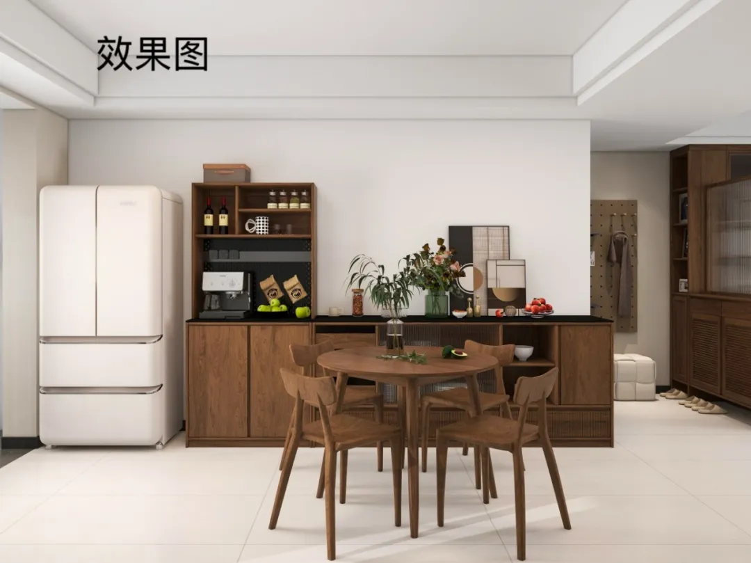 餐边柜同样靠墙摆放,高柜与冰箱齐平
