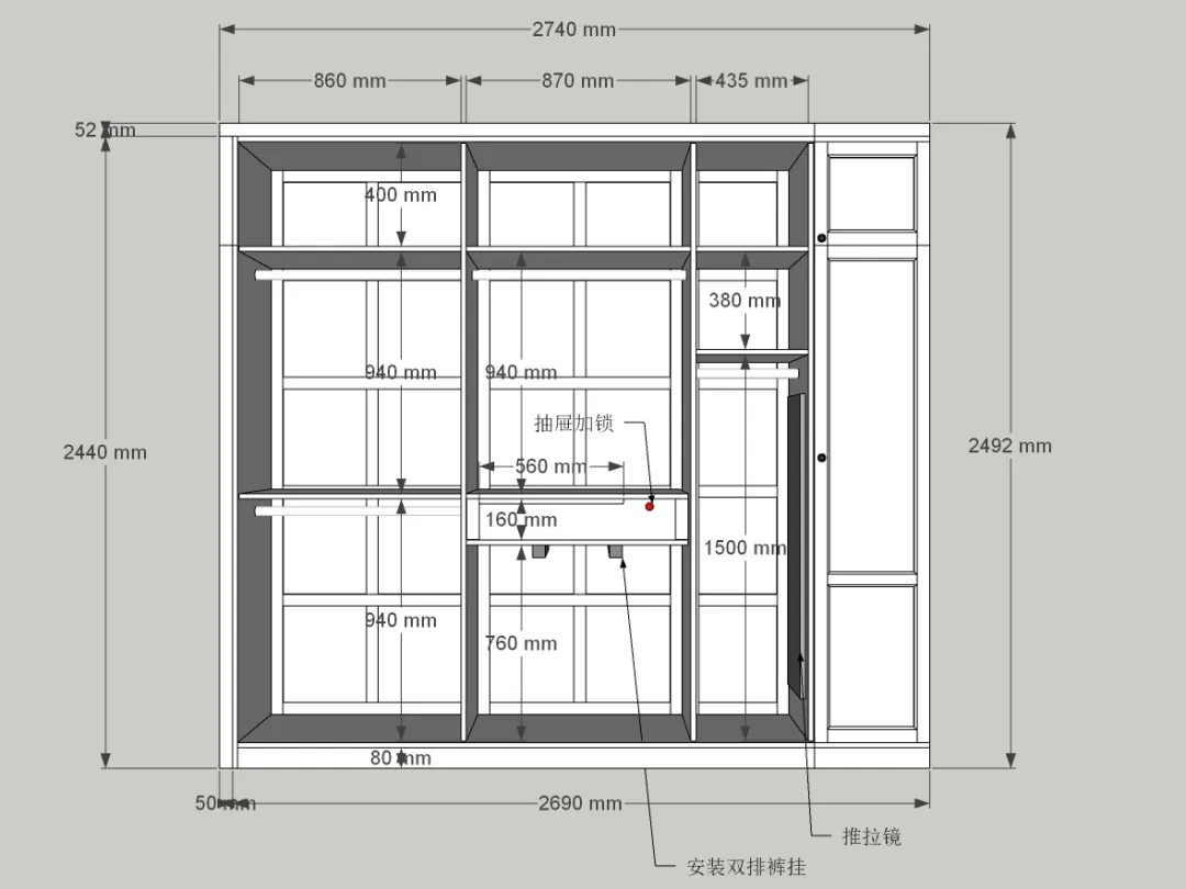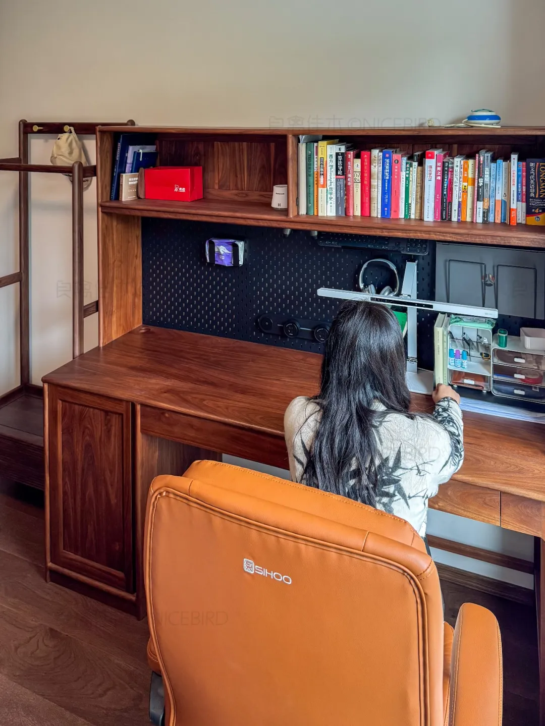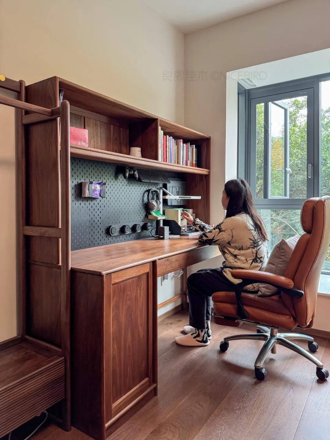 是书桌也是梳妆台,中间留空处特意做了一组洞洞板