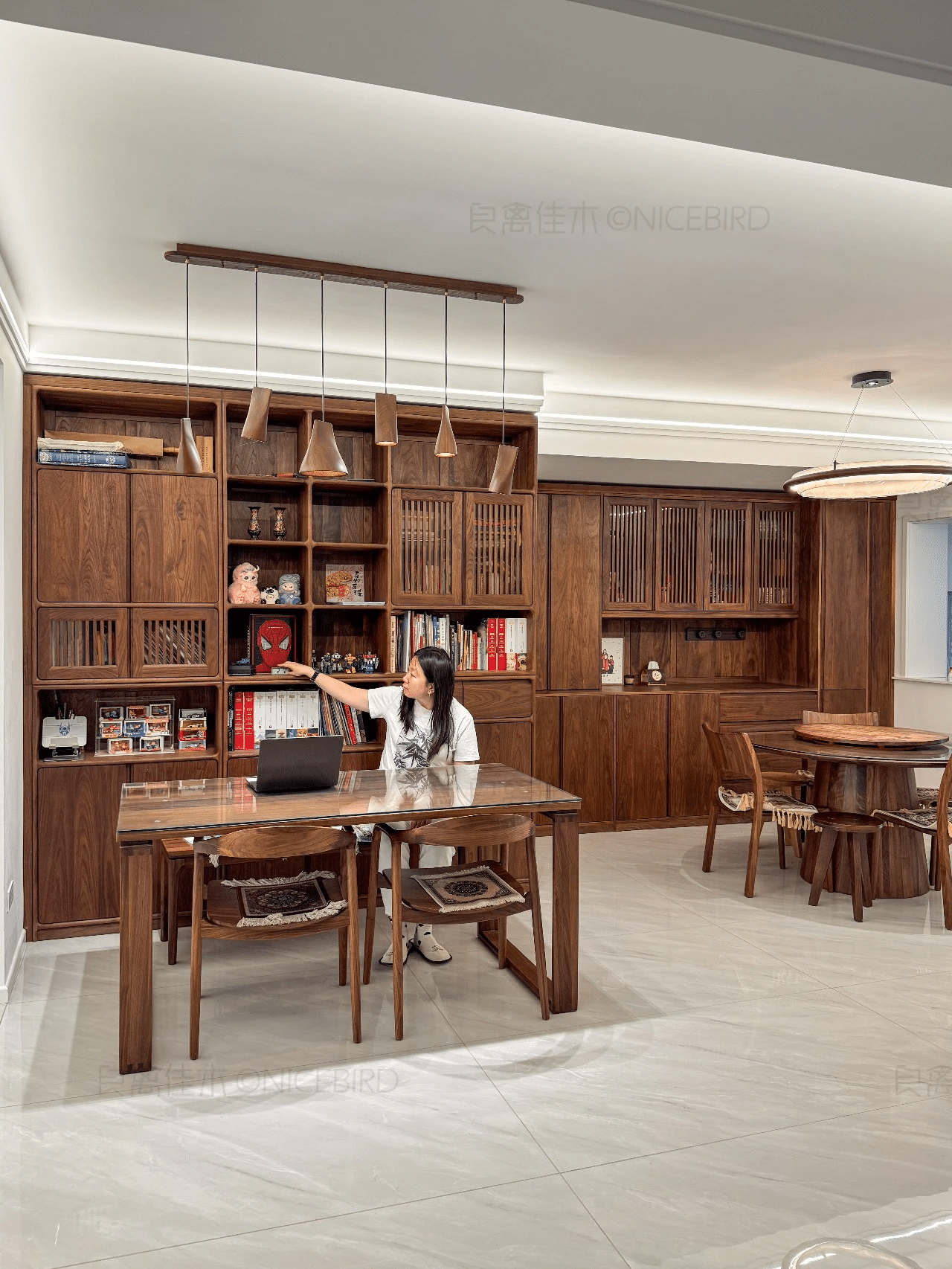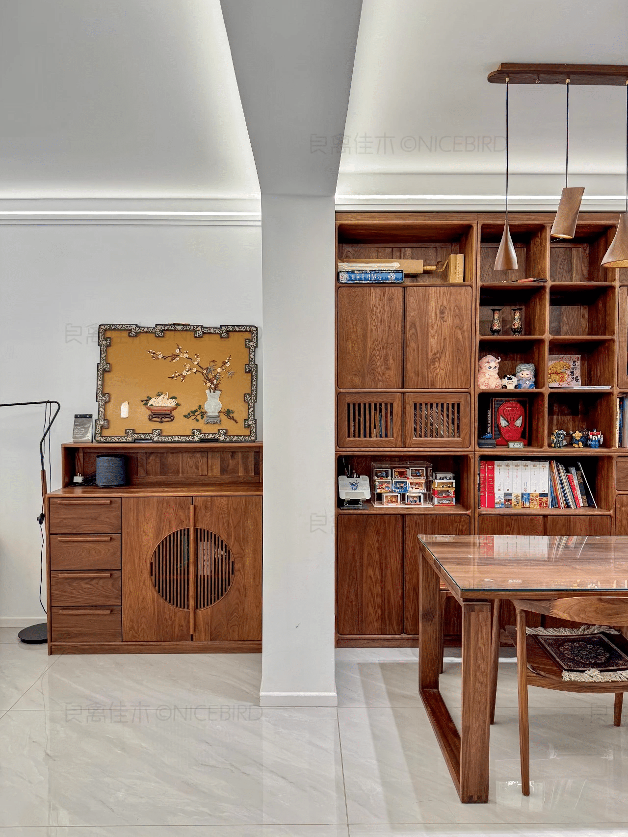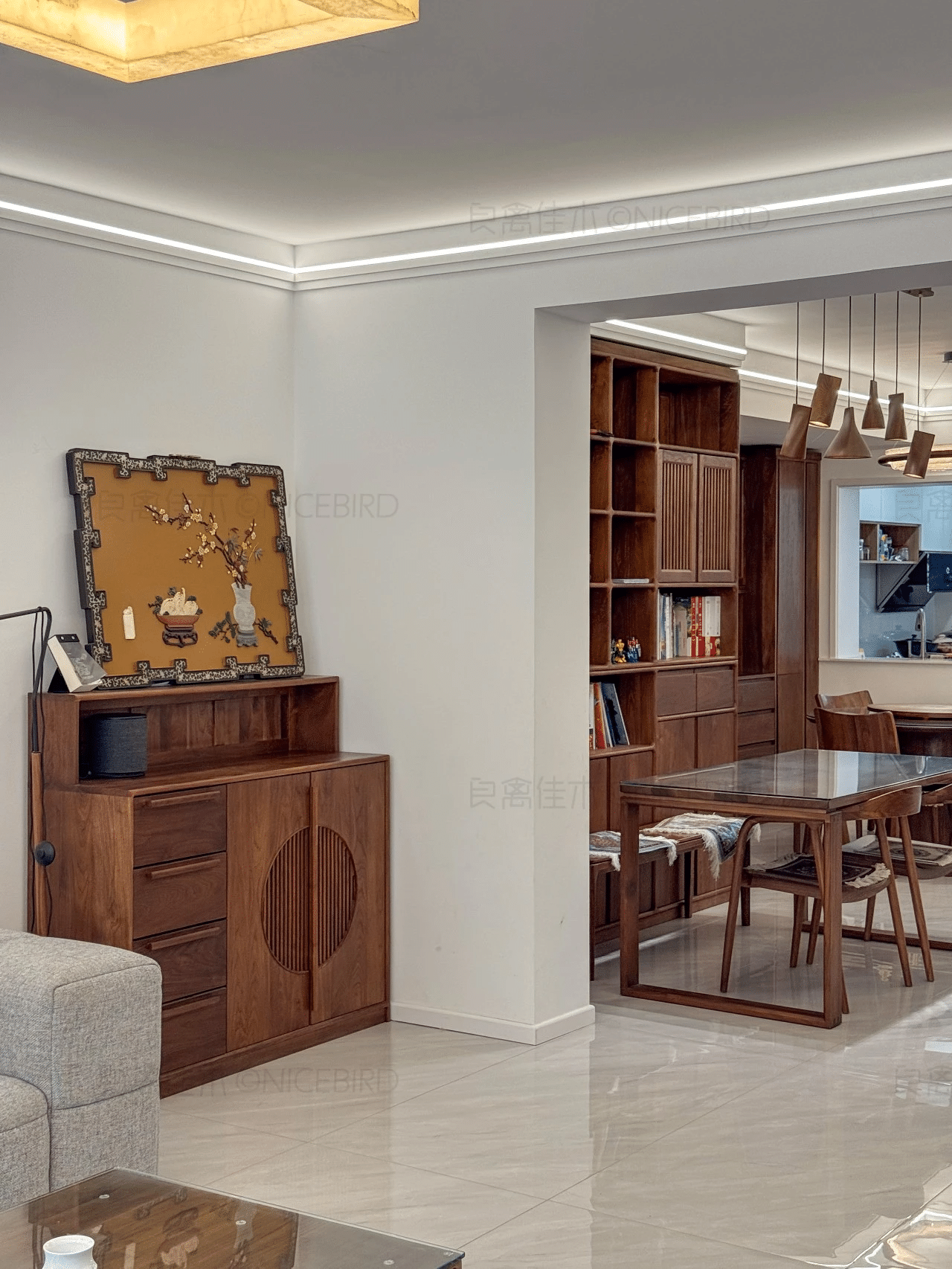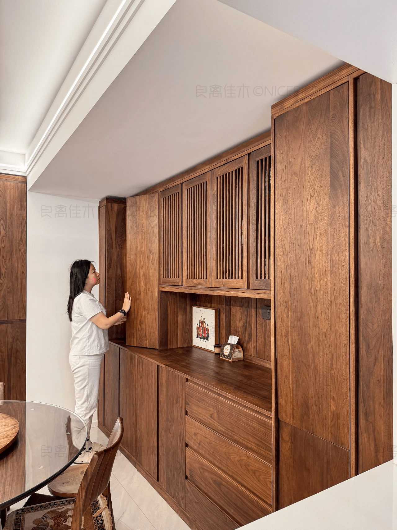 原文案例信息显示,本案涉及“客餐厅定制”,主材为“北美黑胡桃木”,适合从实拍、节点和资料图三个维度来判断是否适合自己家。