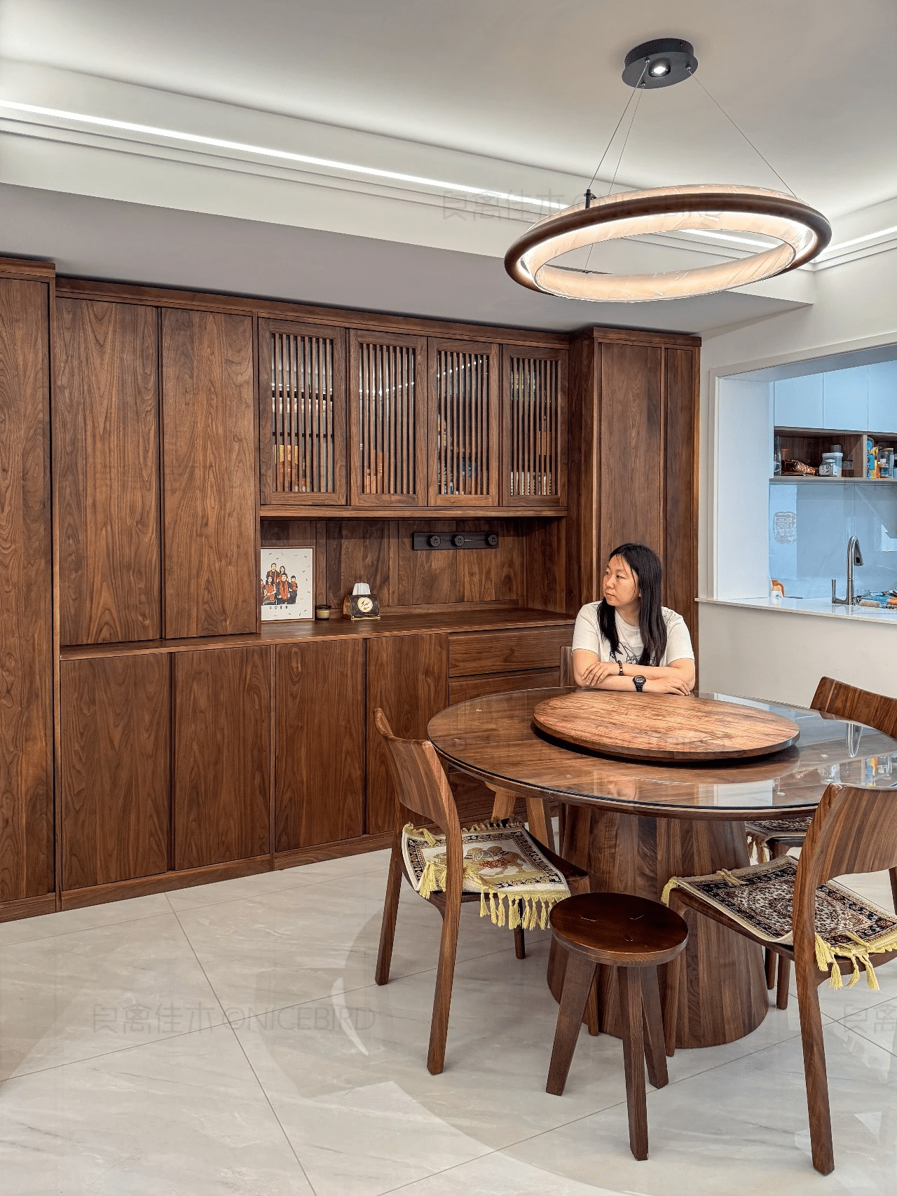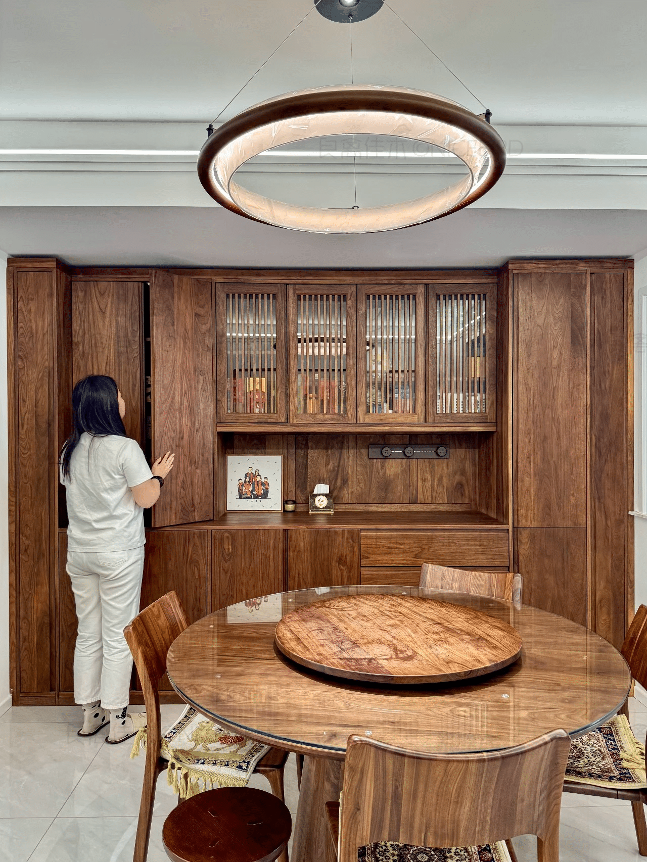 「案例介绍」业主坐标:内蒙古呼和浩特定制空间:客餐厅定制家具材质:北美黑胡桃木设计师:朱俏蓉 入户就是厨房餐厅