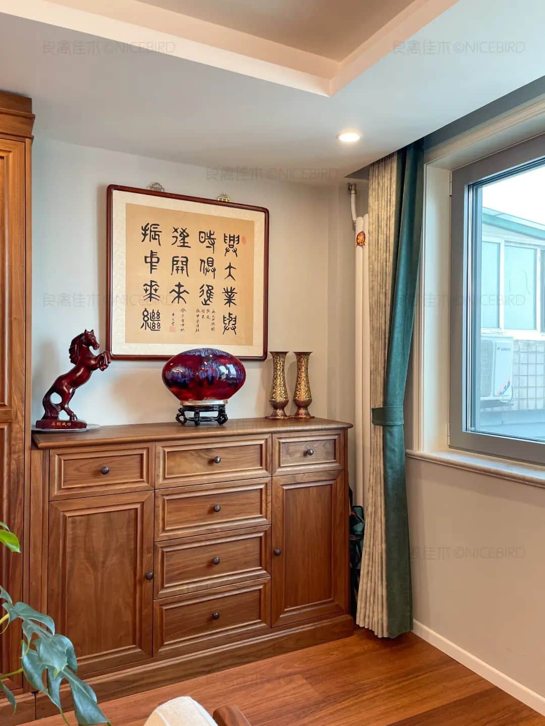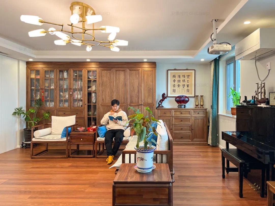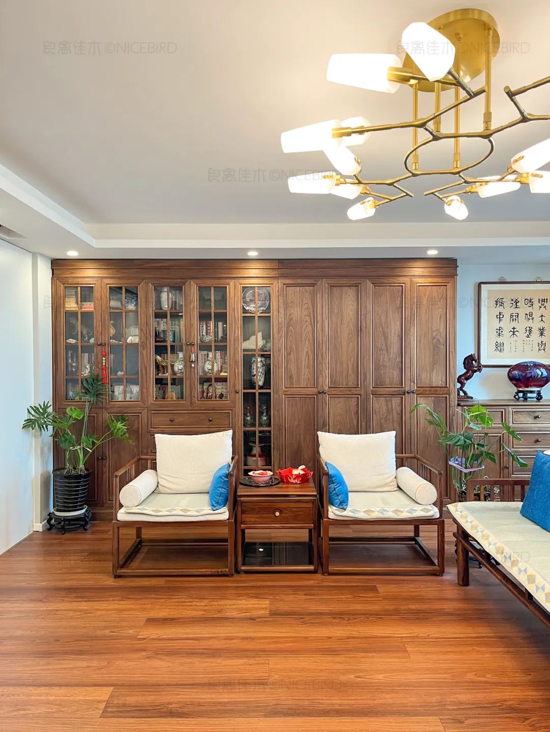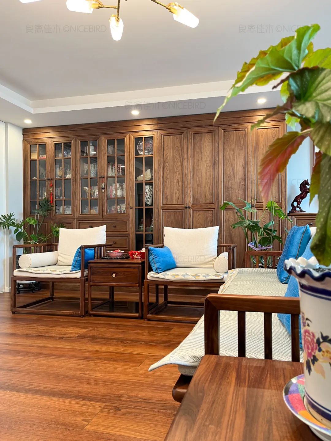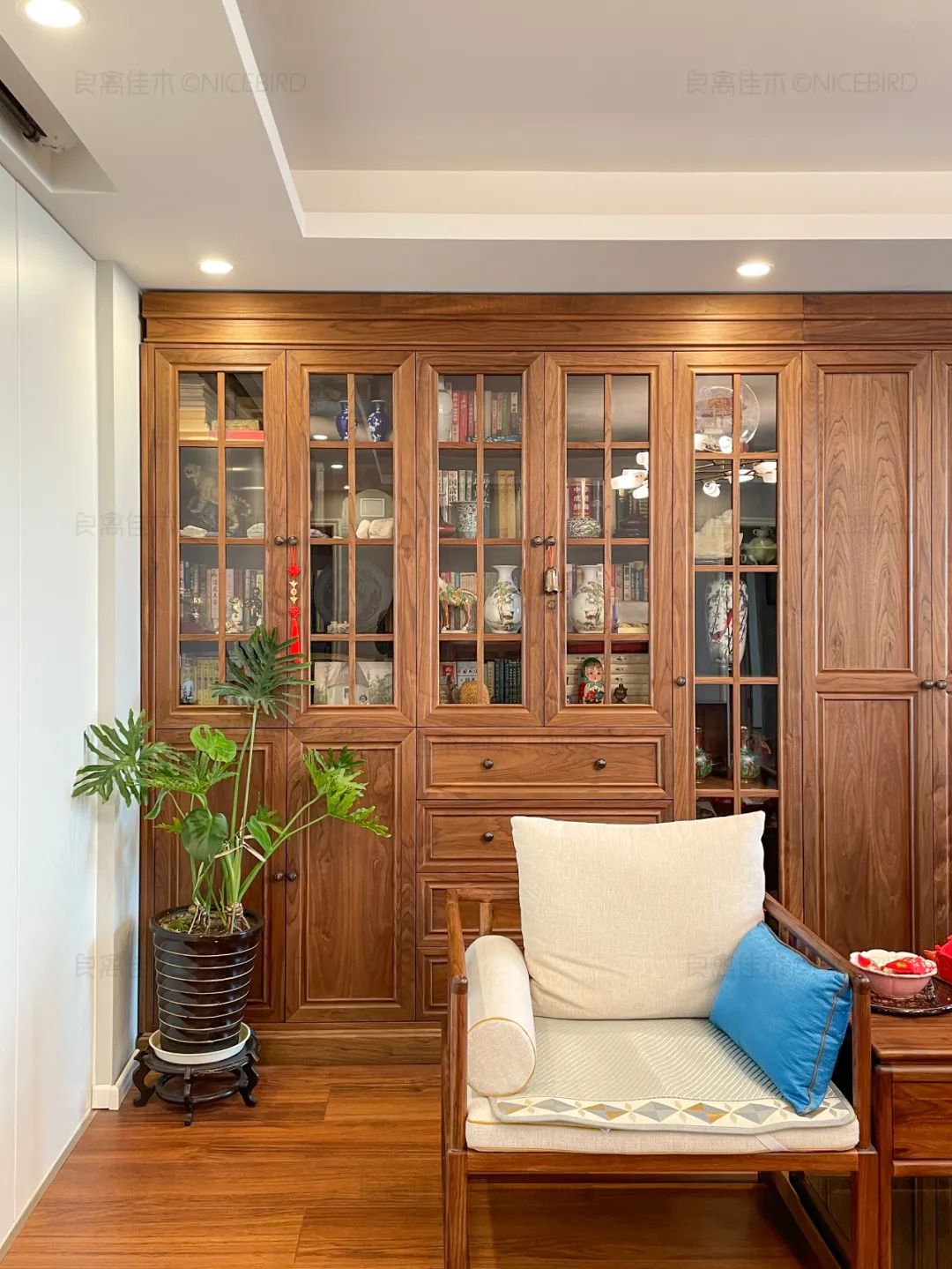 这组黑胡桃木简美书柜+衣柜组合,送货安装(图 2)时就令人爱上了。入住后,北京业主搭配了偏中式的沙发,整个客厅