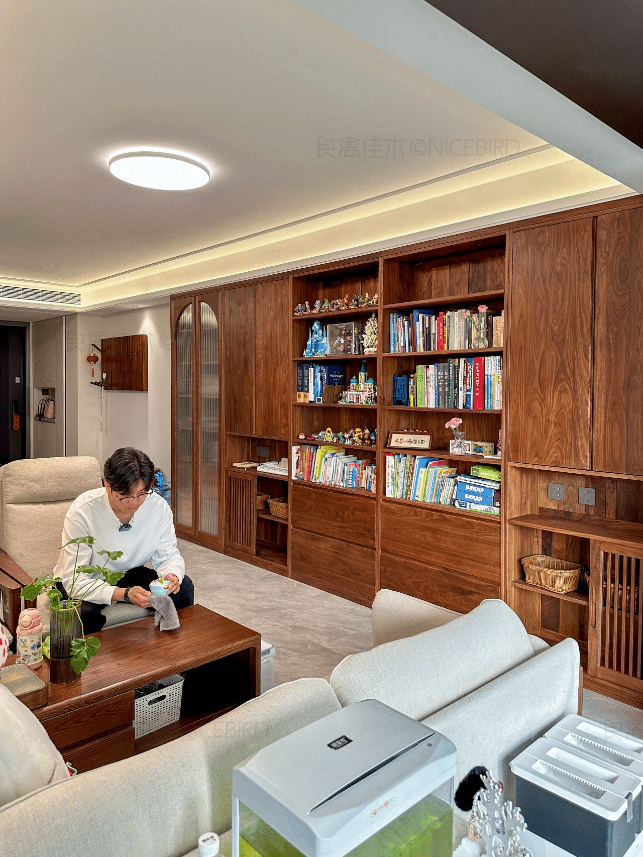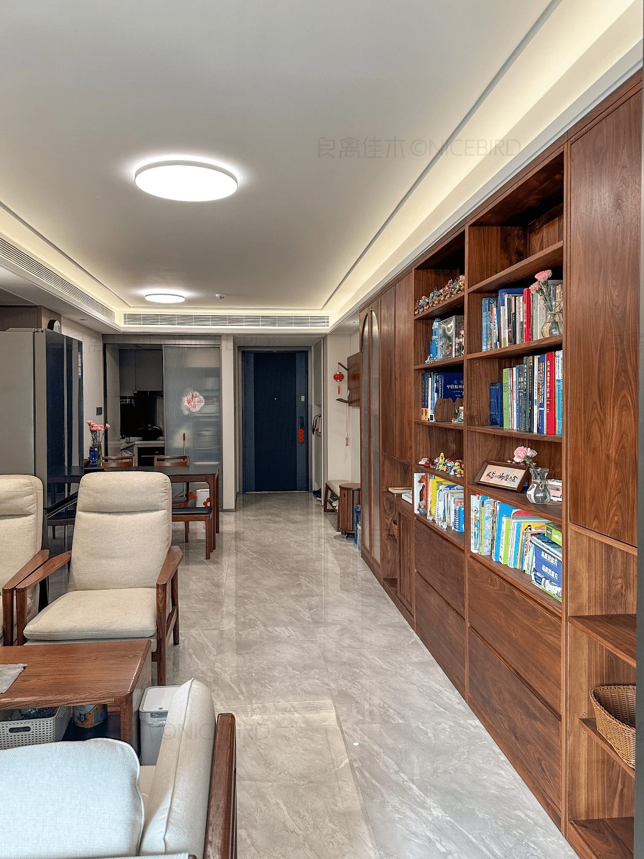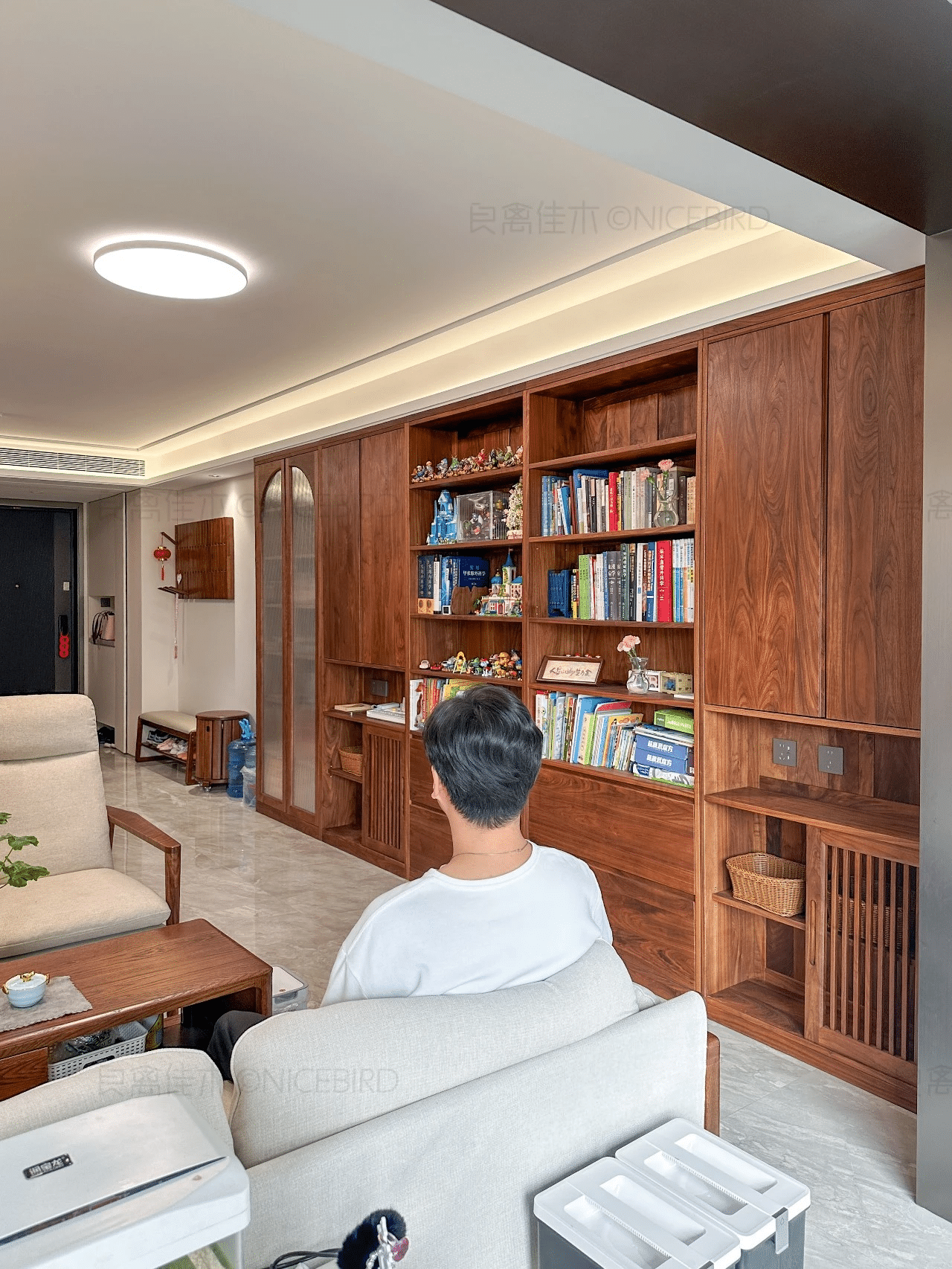 原文案例信息显示,本案涉及“客厅定制”,主材为“北美黑胡桃木”,适合从实拍、节点和资料图三个维度来判断是否适合自己家。